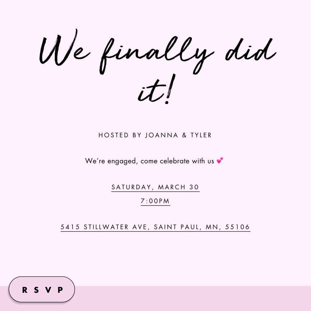 Spend as little or as much time as you want to make the graphic your own. This tutorial features 4 wedding invitation ideas ideal for a beginner. Creating a video invitation for birthdays, weddings, parties, or any other events only takes about 5 minutes with photos, videos, and music. Create an engagement invitation worthy of the occasion with our incredible simple online design software. For more tips, head to our blog for what to write in an engagement party invitation.